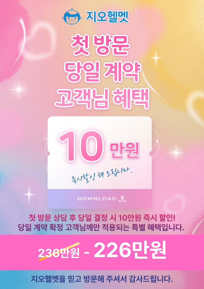 지오헬멧을 첫 방문 / 첫 상담 후 당일 결제 확정하신 고객님들에 한해 할인 혜택 행사를 진행 합니다.